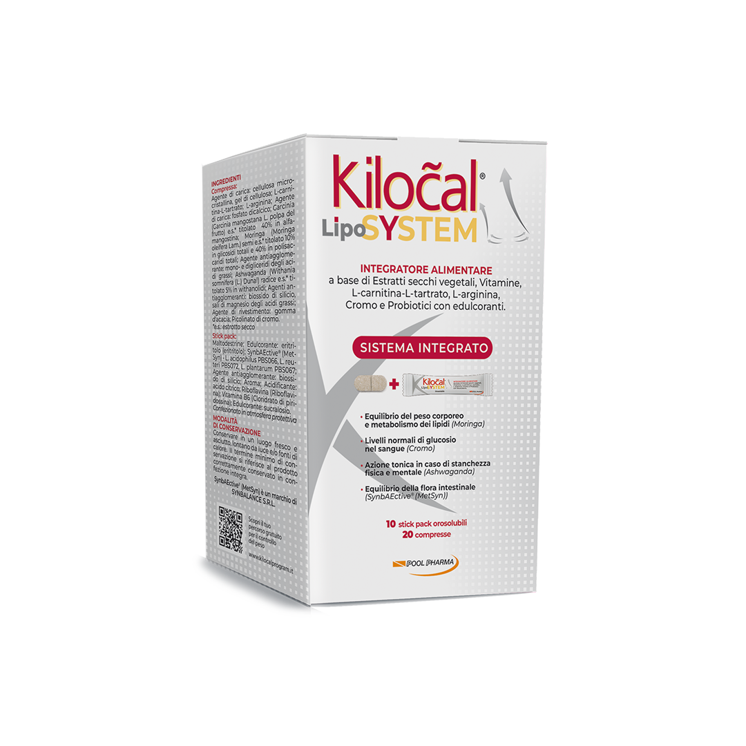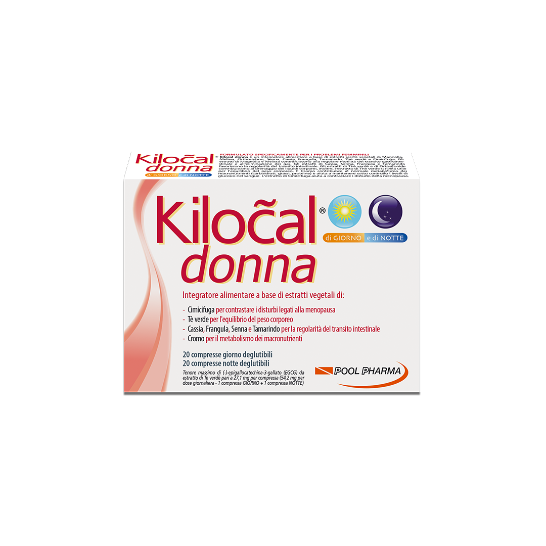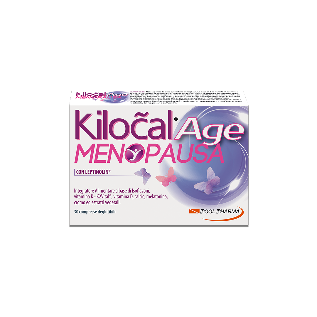 Kilocal Age Menopausa è un integratore alimentare a base di Leptinolin®, Isoflavoni, Estratti Vegetali, Vitamine K2-D3, Calcio e Melatonina, studiato per le donne di 45-50-60-70 anni. Leptinolin®, blend testato scientificamente di e.s. di Banaba e Cromo, e l’e.s. di Moringa Oleifera favoriscono l’equilibrio del peso. In particolare, il Cromo contribuisce al normale metabolismo dei carboidrati, la Moringa al metabolismo dei lipidi e in più alla normale circolazione del sangue.Gli e.s. di Soia e Trifoglio Rosso, fonte di Isoflavoni, aiutano a contrastare i disturbi della menopausa, a favorire un normale metabolismo dei lipidi (Soia) e le funzioni depurative dell’organismo (Trifoglio).La Vitamina K2 – K2 Vital®, forma di Vitamina K a ottimale biodisponibilià (Menachinone-7), contribuisce alla normale coagulazione del sangue e, in sinergia con Vitamina D e Calcio, al mantenimento di ossa normali.L’e.s. di Tamarindo, infine, favorisce la regolarità del transito intestinale, il normale volume e la consistenza delle feci.Kilocal Age Menopausa, senza glutine e naturalmente privo di lattosio, è un prodotto la cui formulazione è oggetto di deposito di brevetto di composizione di proprietà Pool Pharma.